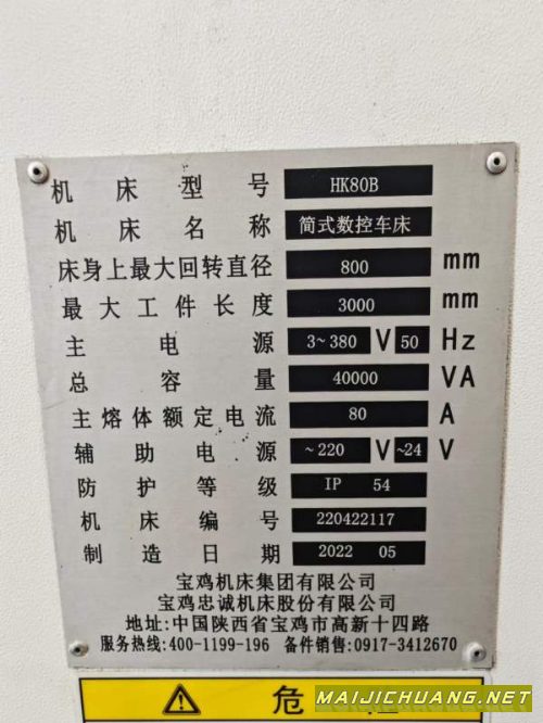 宝鸡2022年产HK80Bx3000数控车,广数系统,导轨宽600主轴孔105,带中心架,准新机。
